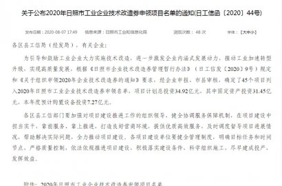 根據《日照市企業技術改造券管理暫行辦法》(日工信發〔2020〕9號)規定和《關于組織申領2020年企業技術改造券的通知》要求,經積極申報,通過市工業和信息化局審核,成功申領2020年日照市工業企業技術改造券。